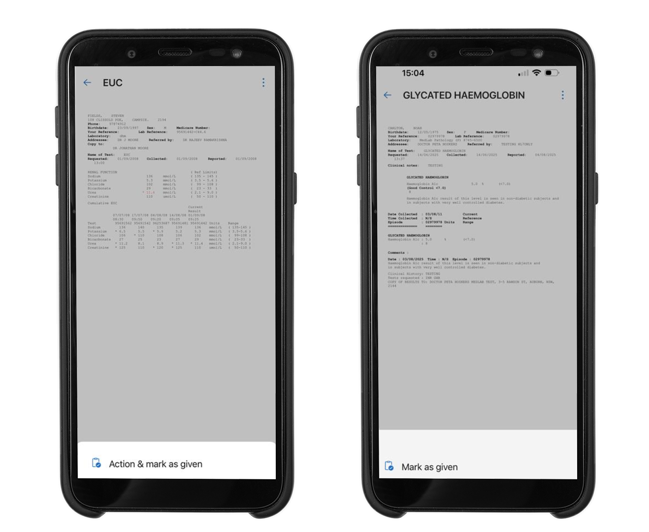 - From Documents in Patient record > Recent documents > Investigation & Correspondence - Select the Actions menu icon and tap Mark as Given.