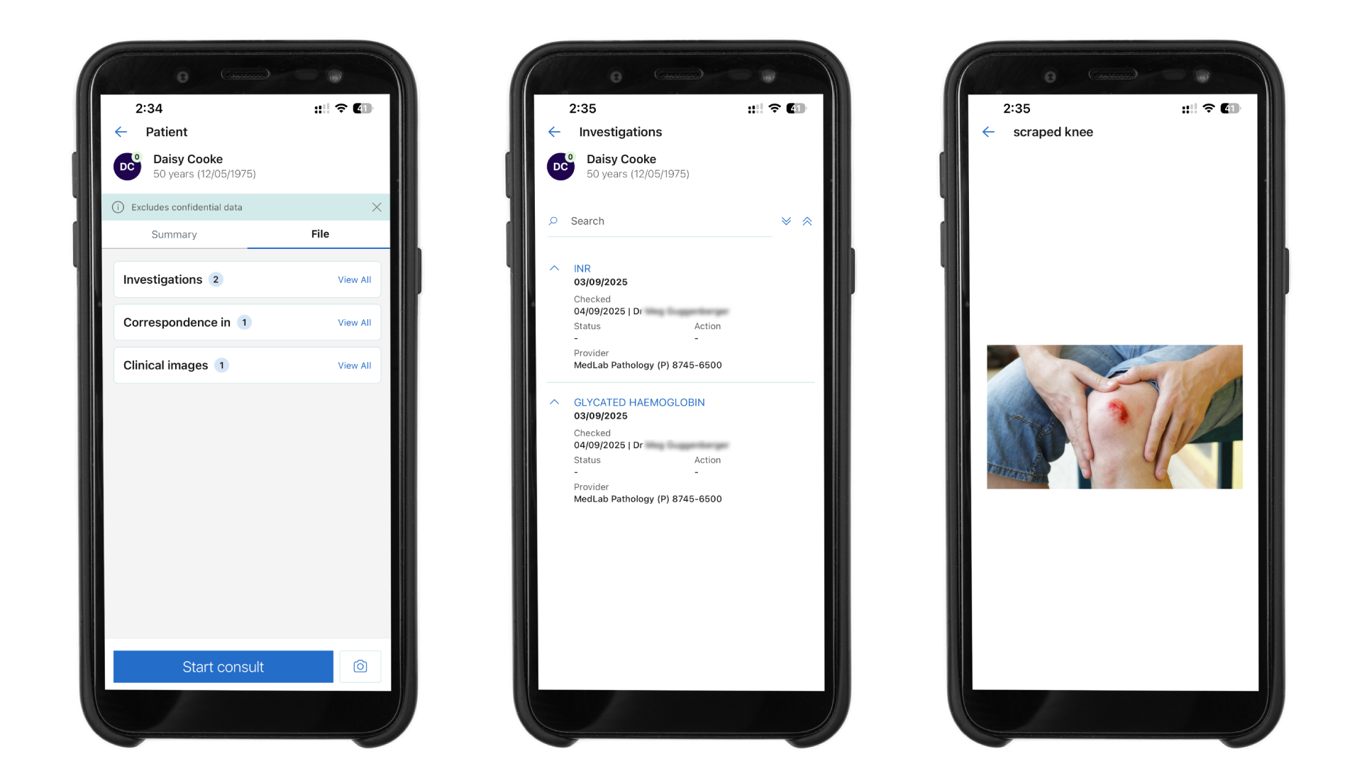 From the Patient Summary, select the File tab to view the patient's documents recorded in Investigations, Correspondence in, and Clinical images.