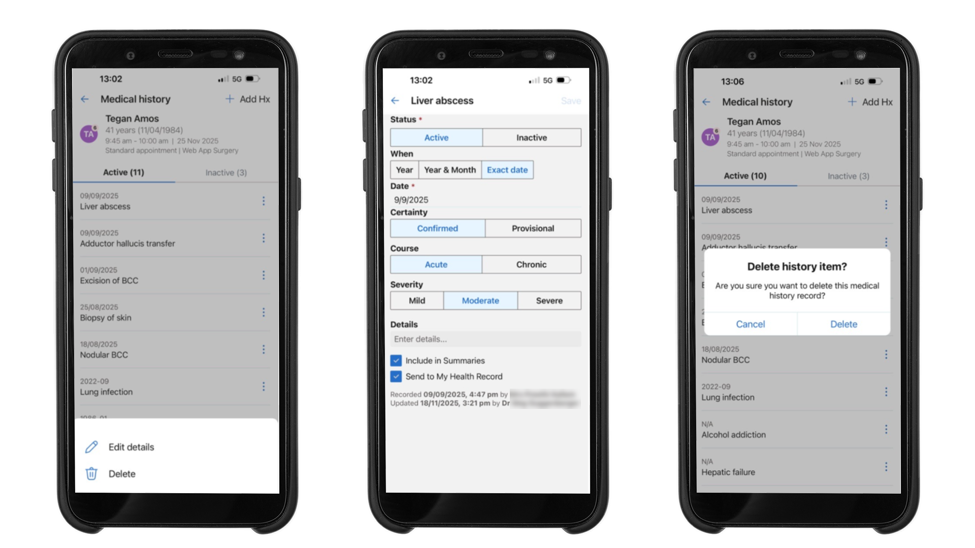 From the Patient record, select View all next to Medical history. Select the actions icon to Edit details or Delete.