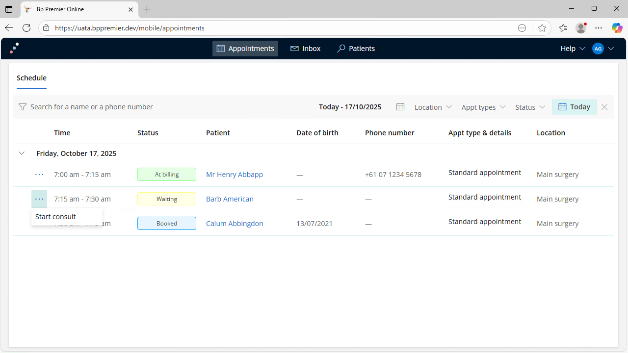 - Use the three dot kebab menu icon to Start consult. Click the patient name to view the patient record without beginning the consult.