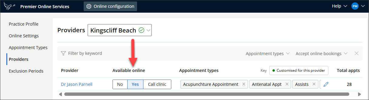 - Usability improvements when making a provider ‘Available online’: The ‘Available online’ column has been repositioned and enhanced, with a more intuitive design and workflow, when enabling your provider for Best Heath Booking.