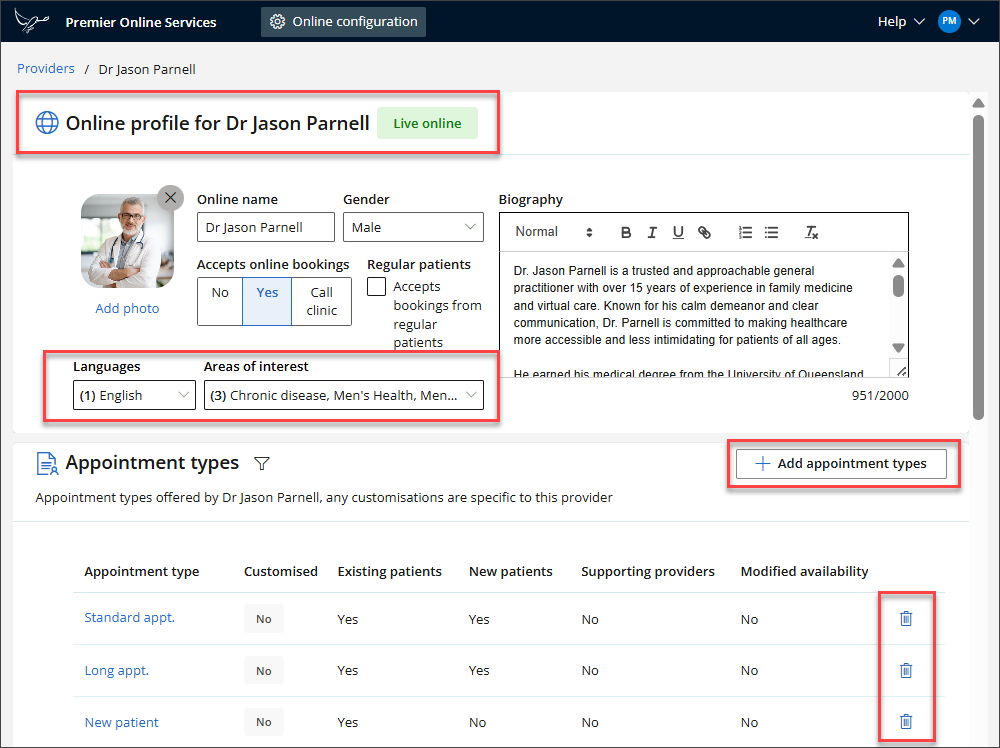 Supporting providers: If your clinic offers services involving a nurse and a GP, these appointment types are now able to be modified in Premier Online Services and booked online.