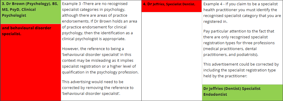 Below are some examples that AHPRA has created to highlight the relevant areas that may be affected by these guidelines. Do note that these are only some of the examples provided.