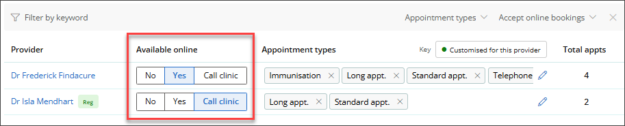 If a provider prefers to be booked by phone, set Accepts Online Bookings to 'Call Clinic'.