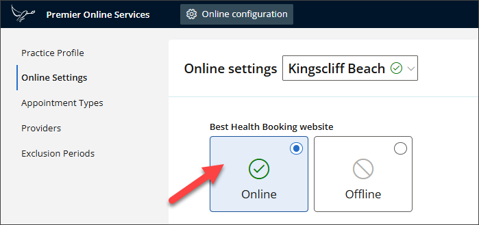 Once you have completed entering your configuration details for all practice locations that offer online booking, and you are ready to test live, you can now activate Online Bookings.