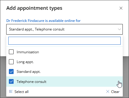 - Search for or select from the available list the Appointment Types to be offered for online bookings, and then click Save.