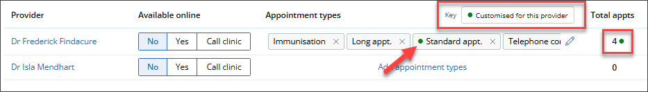 If you have created a modified availability rule for your provider, the 'Total appts' column and the modified appointment type will reflect these changes with a green dot.