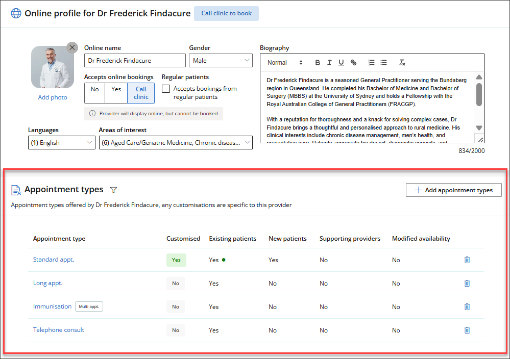 - The provider's Online profile will appear. In Appointment Types, select the Appointment type for which you want to add a supporting provider.