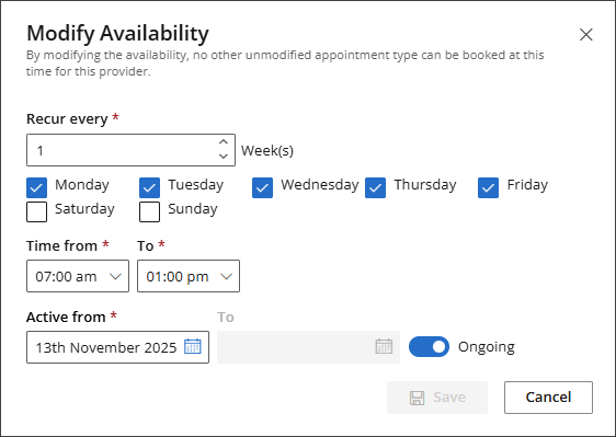 - The Modify Availability modal will appear. Set the Recur every frequency, select the Days, and set the Time from and To fields. Specify the Active from and To dates, or turn on the Ongoing switch if the availability has no end date.