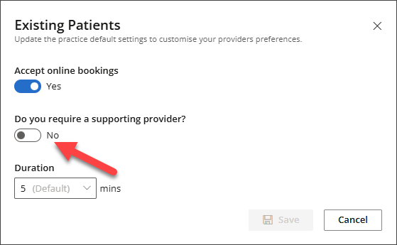 - To Accept online bookings for Existing Patients or New Patients, slide the switch to Yes and enter the appointment Duration.