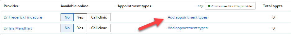 - To accept Online Bookings, you must first set the Appointment Types that each Provider will offer. Click Add appointment types.