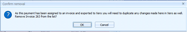An updated Confirm Removal dialog box is displayed when an Invoice is removed from a Payment notifying that the export of that information has taken place and that any changes need to be duplicated in Xero