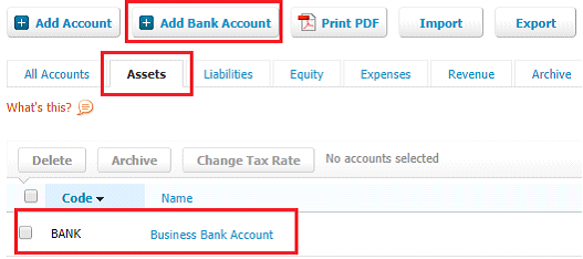 Go to the Assets tab and find the Bank Account code just set up