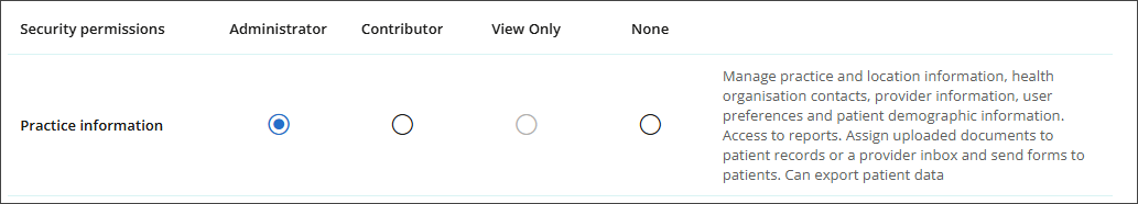 Only users with Practice Information security permissions set to Administrator can adjust the Inactivity timeout settings in Practice & Locations.