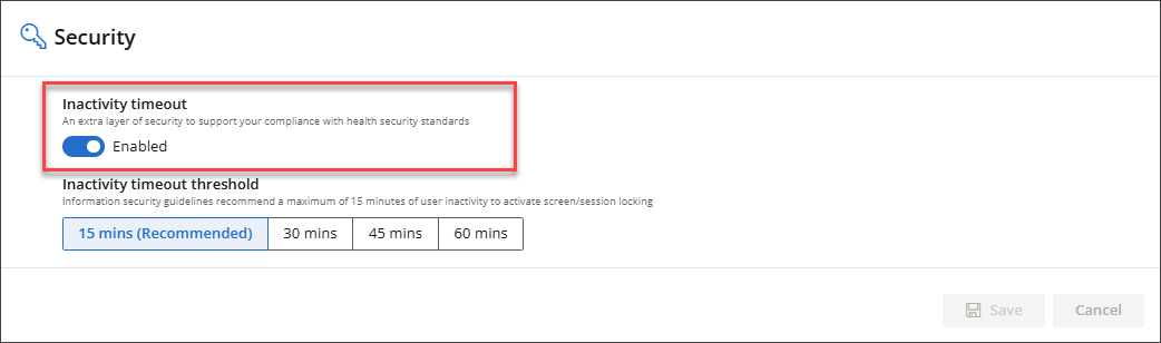 Customers located in Australia do not have this option due to the My Health Record integration that mandates this inactivity lock for integrated Cloud Practice Management Systems.