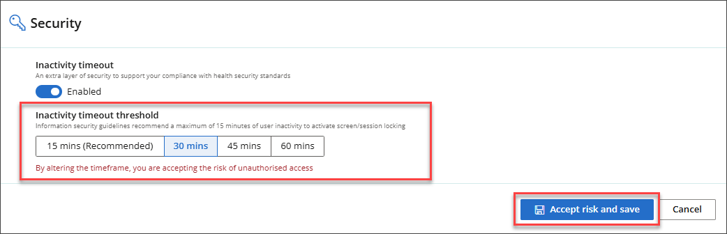 The Inactivity timeout threshold can be increased to 30, 45, or 60 minutes. However, increasing the timeframe also increases the risk of unauthorised access. If you choose to proceed, click Accept Risk and Save.