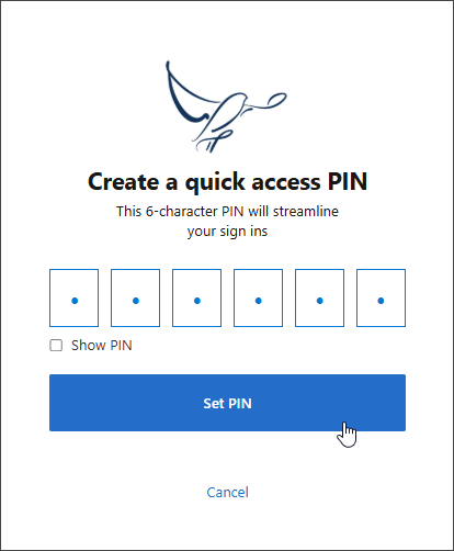 After completing the MFA setup, you will be prompted to create a six-character PIN. The PIN is used to unlock the screen following an inactivity timeout.