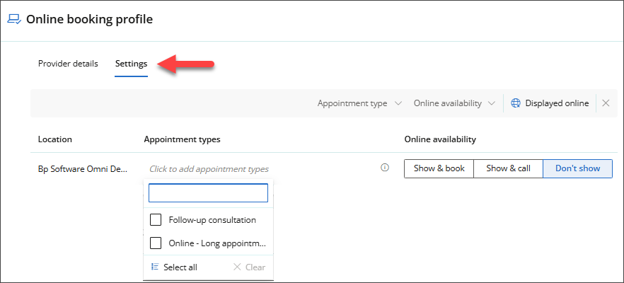 - Show & book: Displays the appointment type online and allows patients to book the appointment directly online.