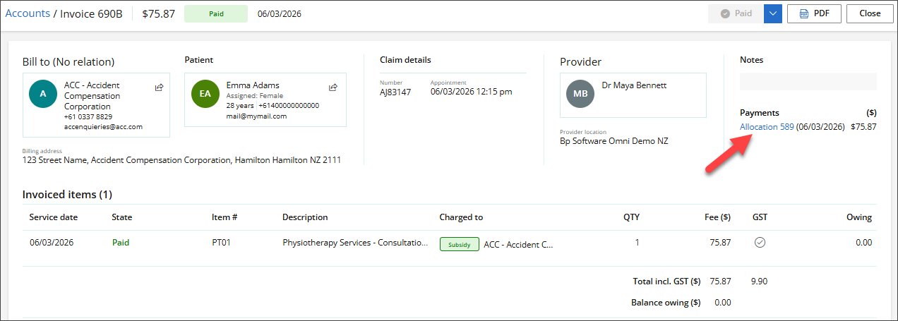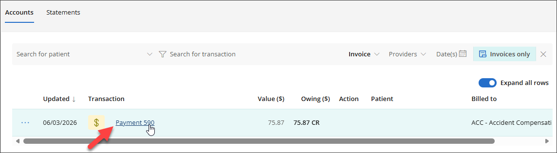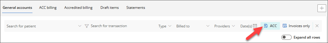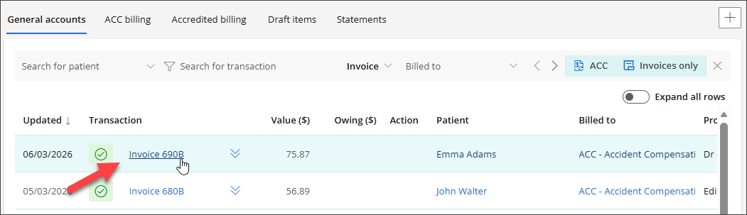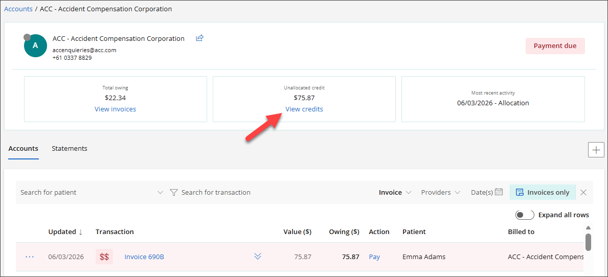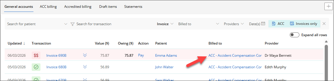 - Select ACC - Accident Compensation Corporation from the Billed To column to open the Accounts screen.