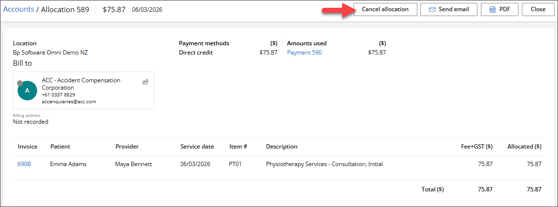 - The payment allocation will be displayed. To cancel the allocation, click Cancel allocation.