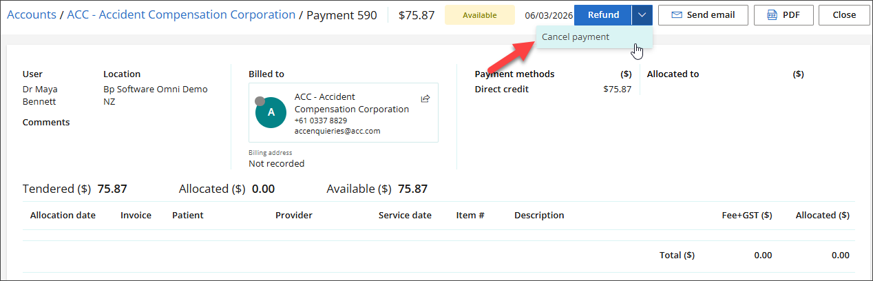 ACC payments should not be recorded manually. Reconciliation information is retrieved automatically each day via the ACC API and displayed on the Finance > ACC Billing screen. If an ACC payment has been manually processed in error, follow the steps below to cancel the payment.