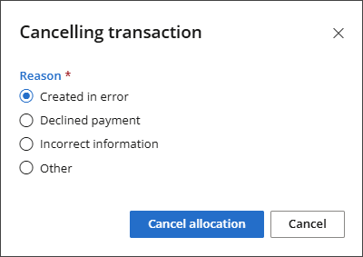 - The Cancelling Transaction modal will appear. Select a Reason for cancelling the allocation, then click Cancel Allocation.