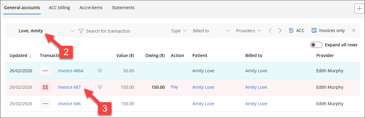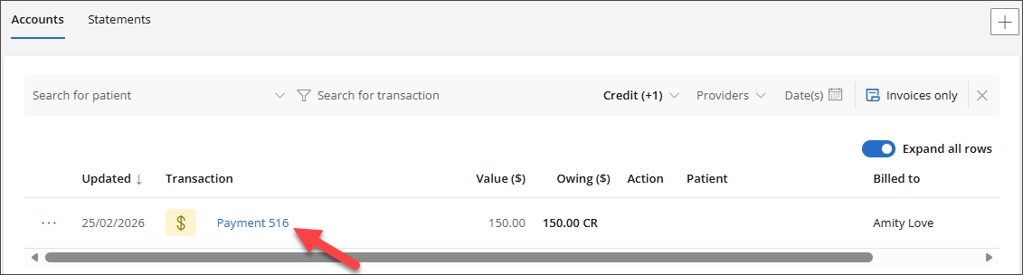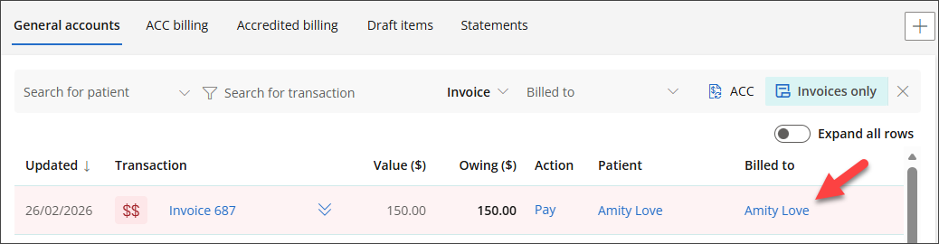 - Select the Patient Name or Account Holder Name from the Billed To column to open the Accounts screen.