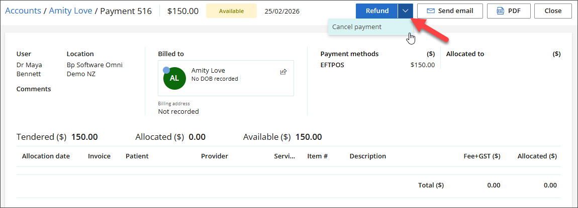 - The payment will appear. Click the down‑arrow next to Refund, then click Cancel payment.