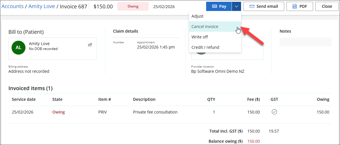 - The invoice will open. Click the down‑arrow next to Pay, then click Cancel Invoice.