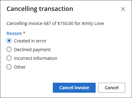 - The Cancelling Transaction modal will appear. Select a Reason for cancelling the invoice, then click Cancel Invoice.
