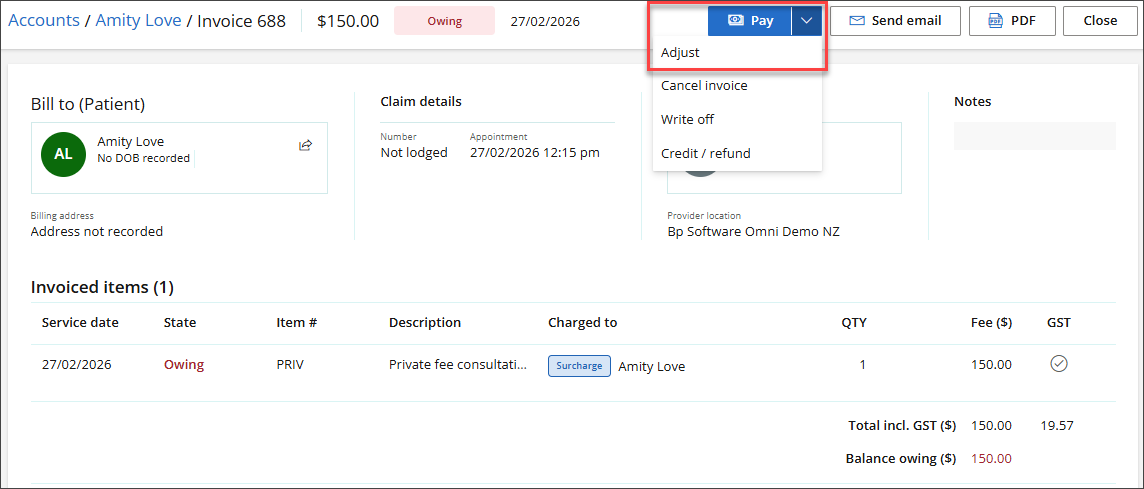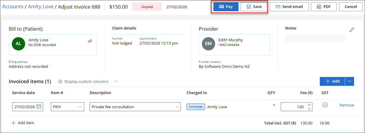 - Edit the existing invoiced items or add new items as needed, then click Save to update the adjusted invoice, or select Pay to record a payment.