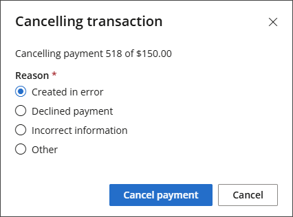 - The Cancelling Transaction modal will appear. Select a Reason for cancelling the payment, then click Cancel Payment.