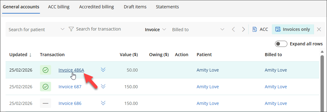 - Use the Search by name field to quickly locate the account holder to whom the invoice is billed.