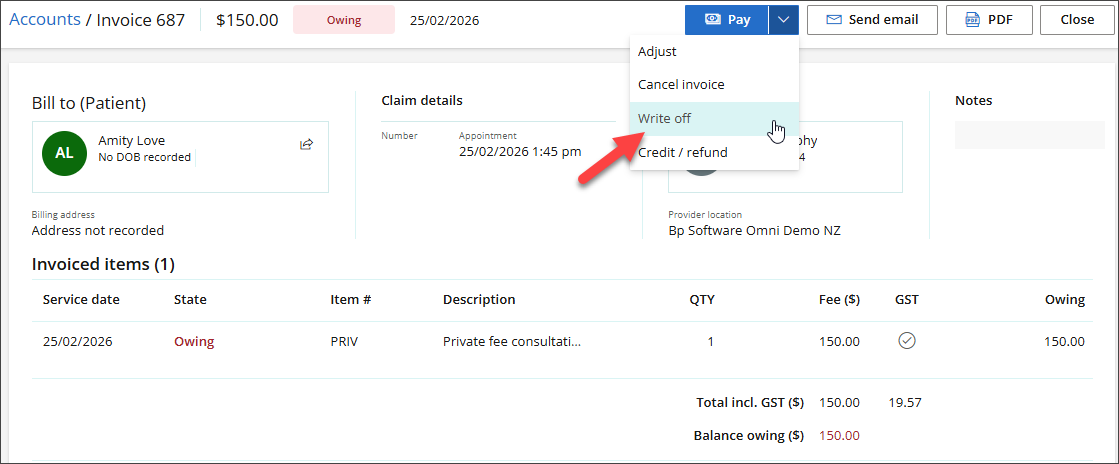 - Click the down-arrow next to Pay and then click Write off.