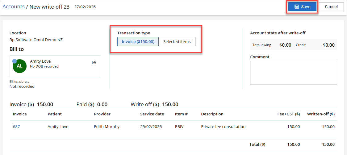To write off the full invoice, keep Transaction Type set to Invoice and select Save.