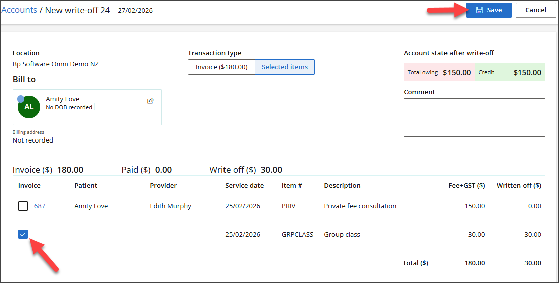 - To partially write off selected items, choose Selected items as the Transaction type, tick the checkbox for each invoice line you want to write off, and then select Save