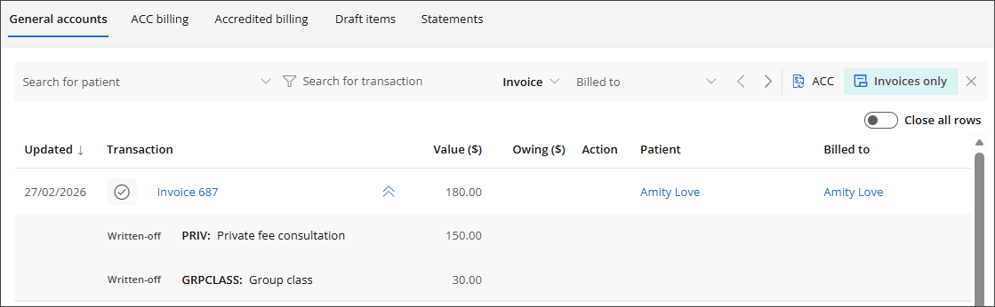 Fully written off invoices appear in the Accounts screen with a grey tick, and you can expand them to view additional details.