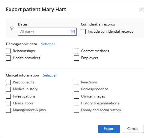 - In Demographic data, click Select all to export all demographic data or tick the items to export: Relationships, Health providers, Contact methods or Employers.