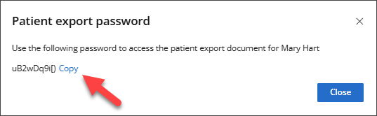 - The Patient export password modal displays the password for the exported PDF. Click Copy to copy the Password before clicking Close.