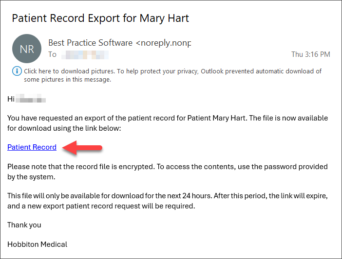 NOTE This file will only be available for download for the next 24 hours. After this time, the link will expire, and you will need to export a new patient record.
