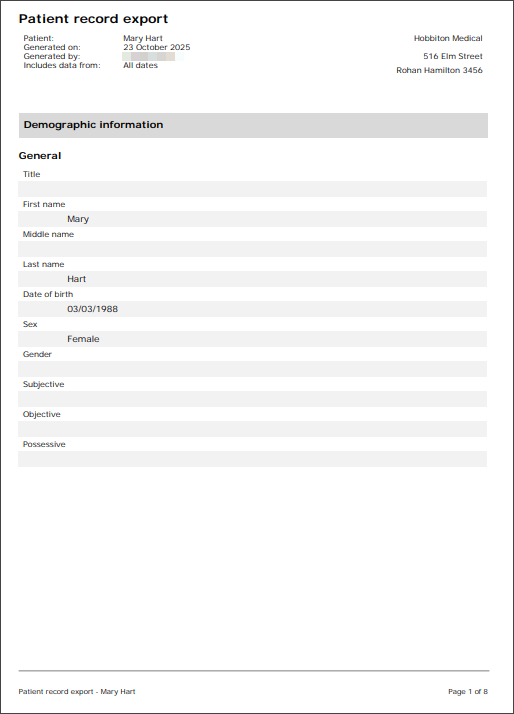 The patient’s demographic details, including name, address, and date of birth, are always included in the export.