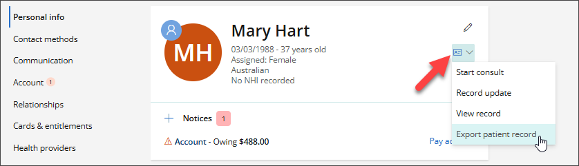 - When viewing the patient Demographics, click the clinical record icon, then click Export patient record.