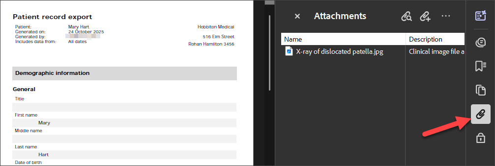 - If Correspondence, Investigations or Clinical images are included in the export, you can view them in the Adobe Acrobat clicking the paperclip icon.