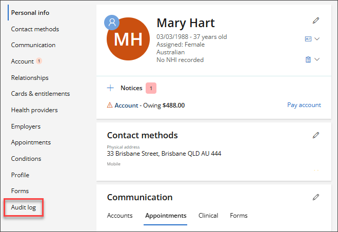 - The patient's Audit log can be viewed on the Patient Demographics screen.