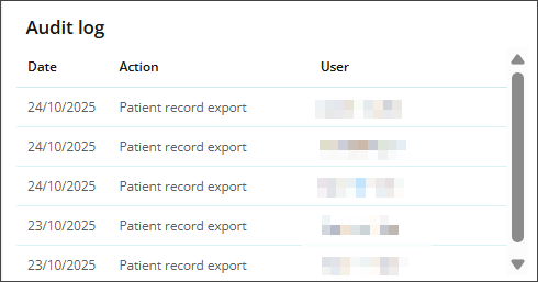 Each time a patient record is exported, an entry is recorded in the patient’s Audit log.