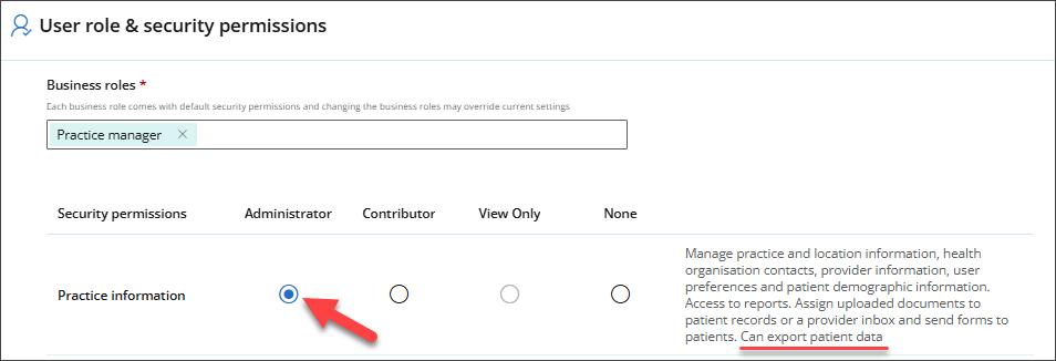 Only users with the Security permission for Practice Information set to Administrator can export patient records.