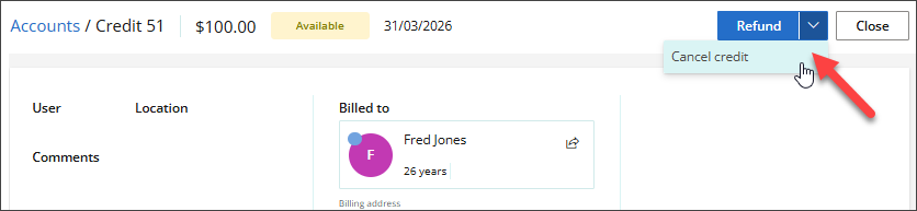Credits can now be cancelled if created in error. A Cancel credit option has been added, and cancelled credits will no longer show any outstanding, unallocated, or available amounts.