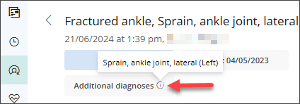 In Past Consults, the diagnosis header now includes the Side, Onset date, and Diagnosis details, with a tooltip that shows any Additional diagnoses recorded on the claim.