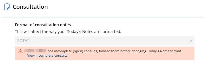 The Today's Notes format cannot be modified in Profile > Users > Clinical Settings > Today's Notes while a provider has unfinished consults. This change prevents situations where notes may not appear correctly if the format is changed before consultations are finalised.