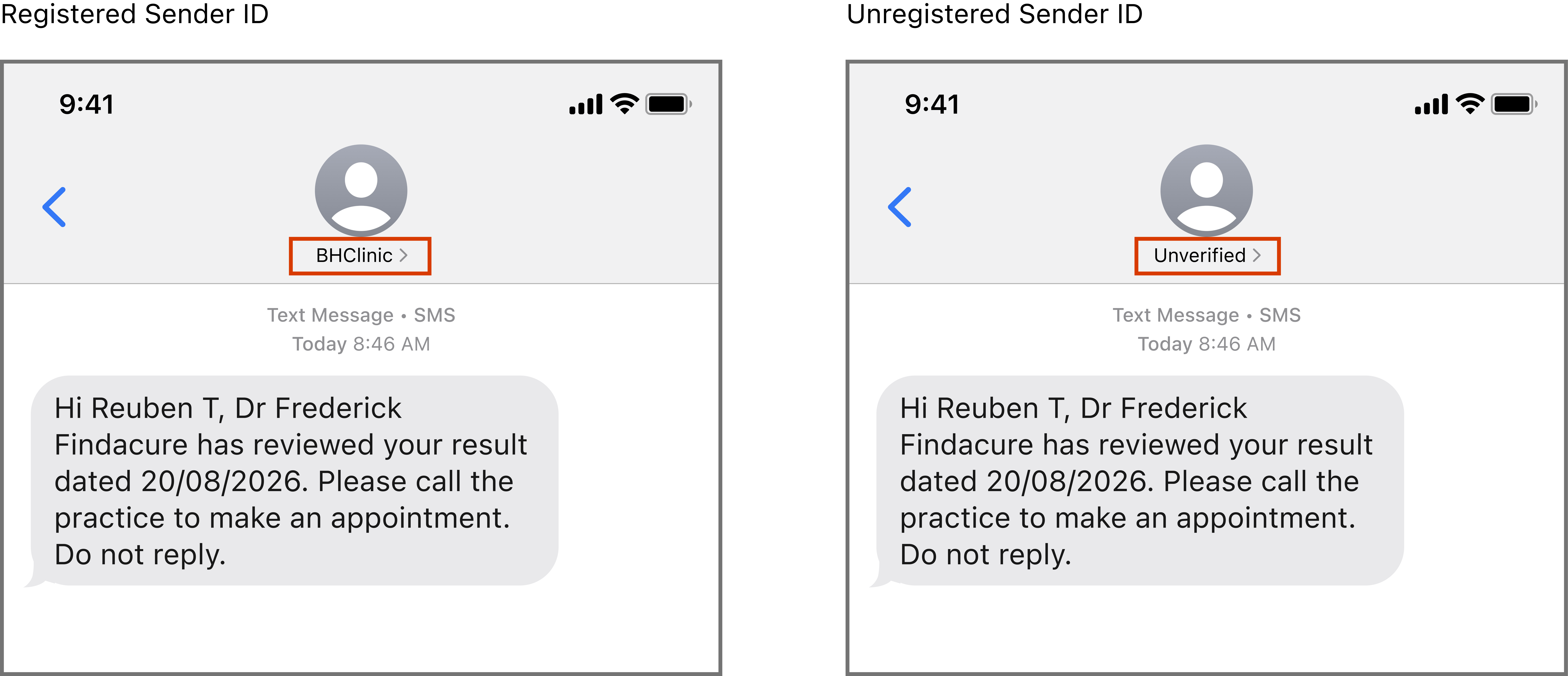 If you do not register your Sender ID by 1 July 2026, your messages will appear as "unverified" and will be grouped together in a single message thread on recipients' phones. This signals to recipients that the message might be a scam, which could significantly reduce the effectiveness of your patient communications.